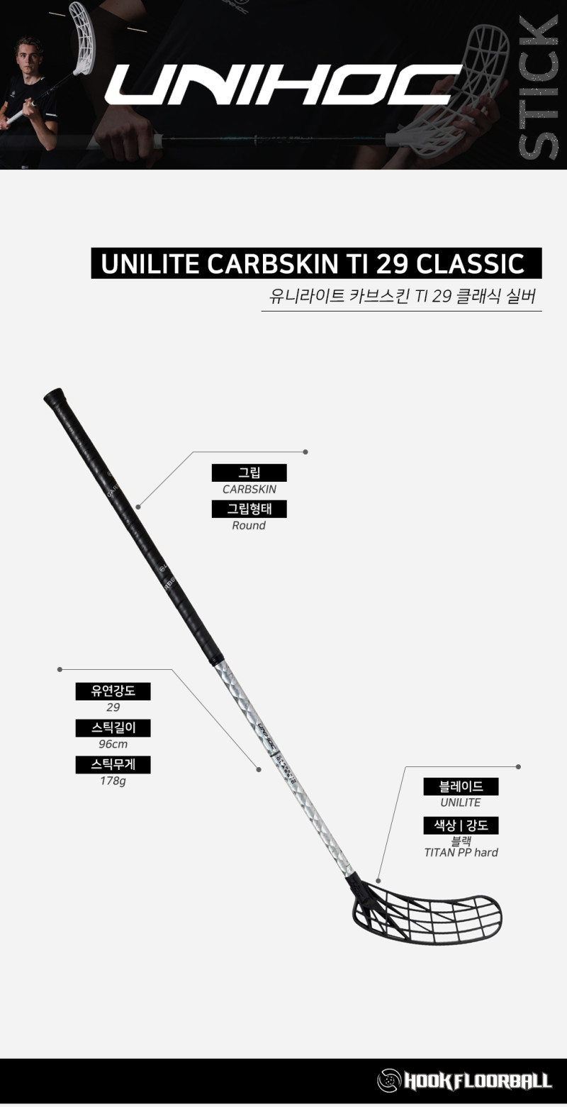 플로어볼 스틱 - UNIHOC) UNILITE CARBSKIN TI 29 silver Classic 96cm